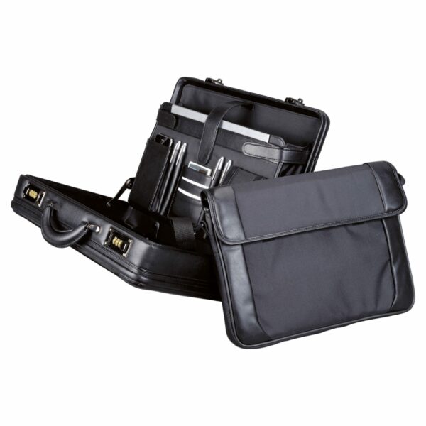Dehnfalte, zwei Zahlenkombinationsschlösser. Innen: Herausnehmbare Laptoptasche mit Schultertragegurt, vier Schreibgeräteschlaufen, zwei A4 Fächer, zwei Utensilienetuis, drei Visitenkartenfächer.