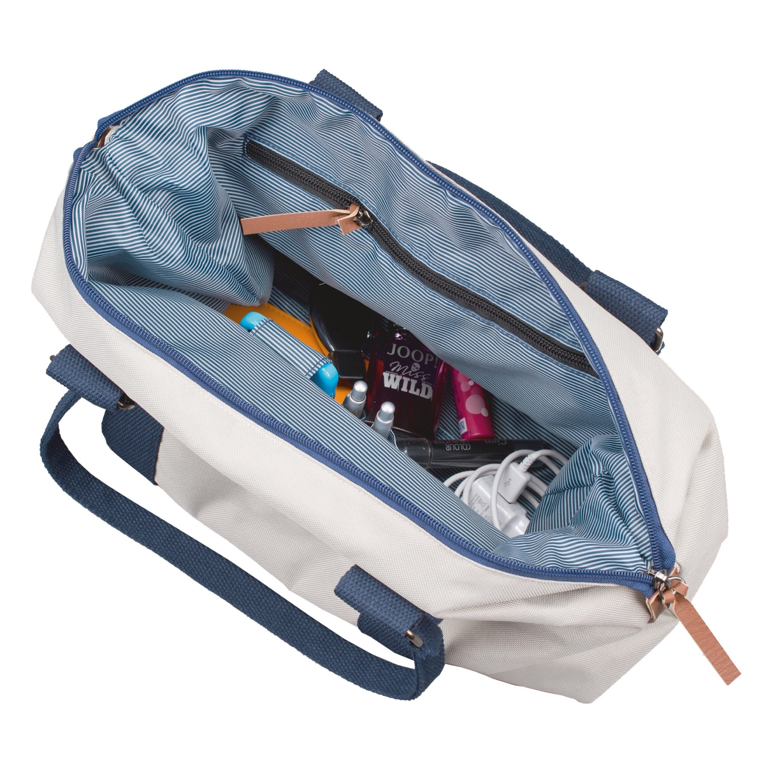 Trageriemen, Einsteckfach außen. Innen: Reißverschlussfach, Handyfach, zwei Stifteschlaufen, liniertes Futter.