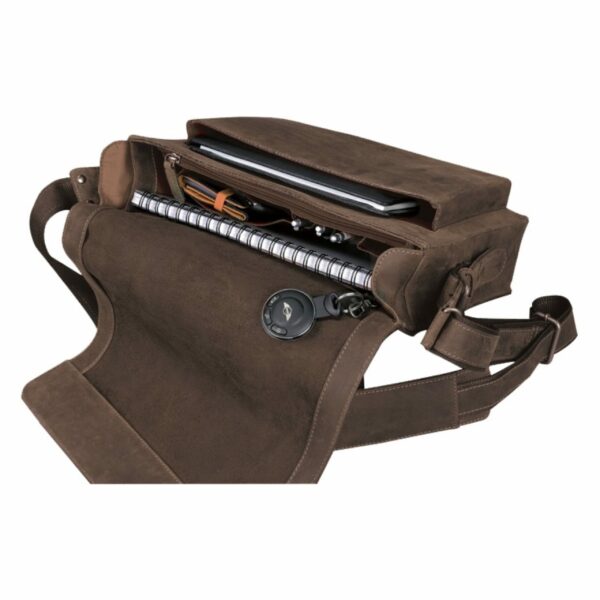 Verstellbarer Schultertrageriemen, Reißverschlussfach im Rücken, Klappe mit Klettverschluss. Innen: Reißverschlussfach unter der Klappe, zwei Fächer, Reißverschlussfach, Hauptfach mit Handytasche, drei Stiftschlaufen, Einsteckfach.