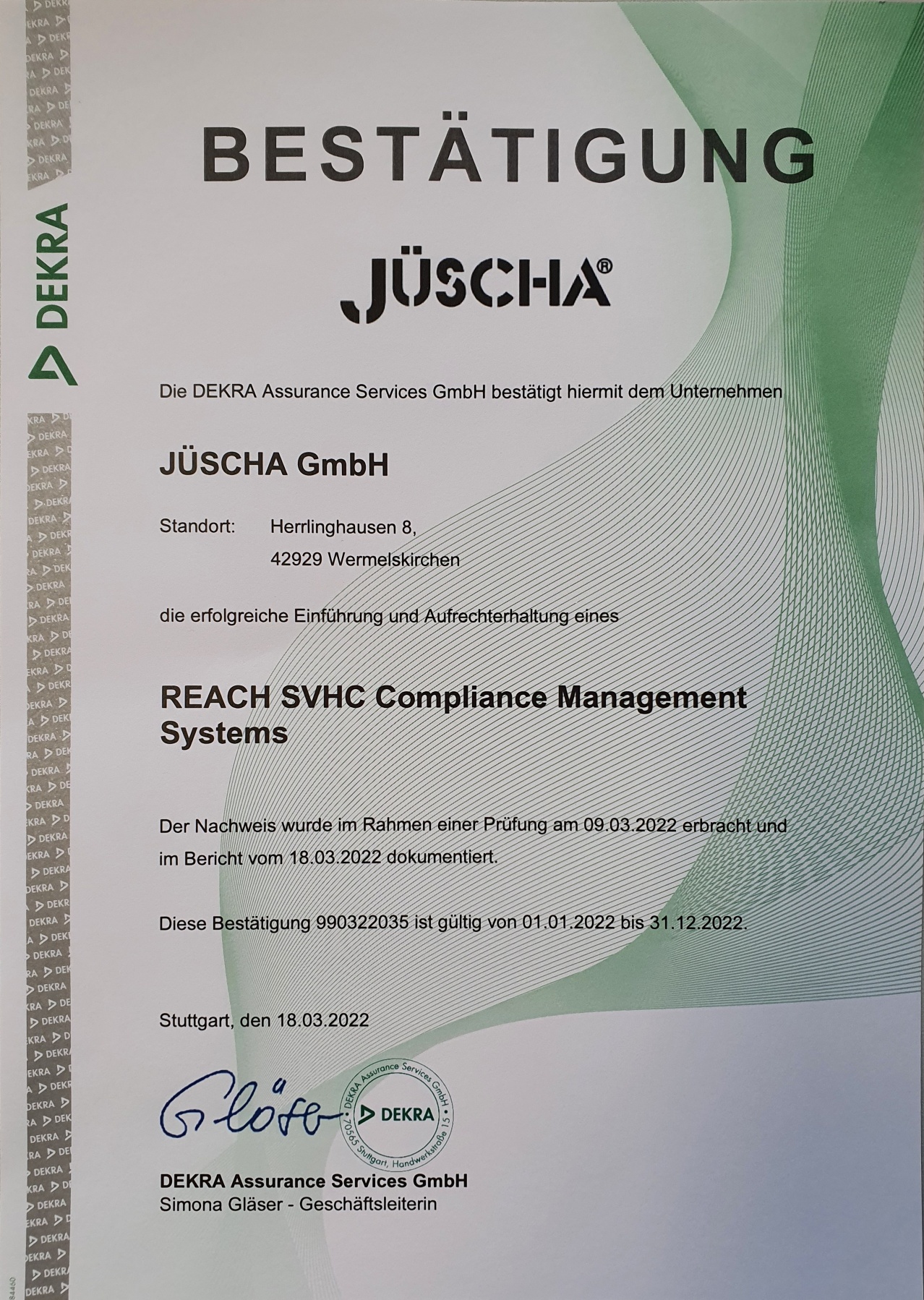 Jüscha® GmbH was awarded the DEKRA the successful establishment of a REACH-compliance management system.