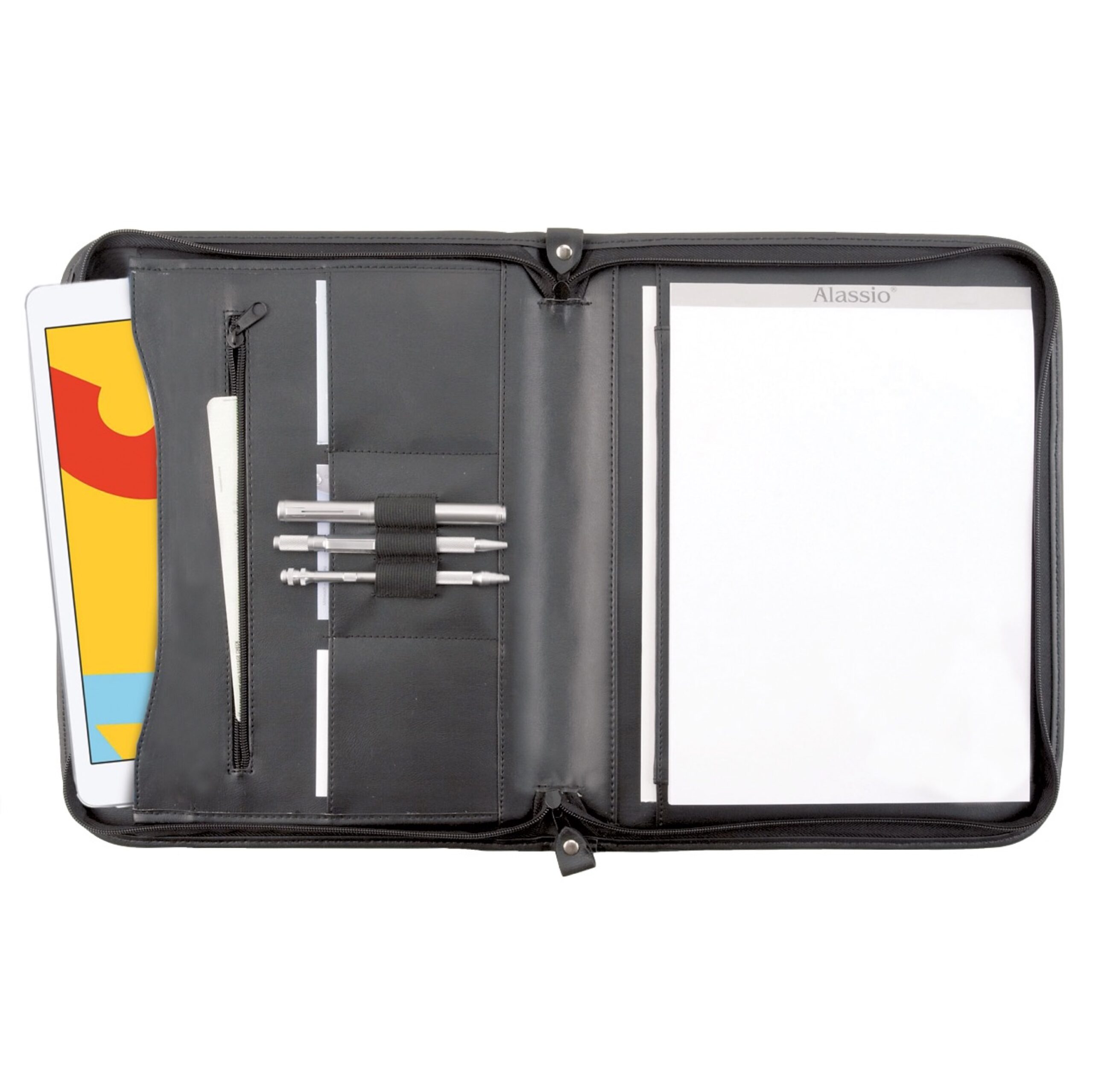 Fächertasche, Einschubfach für ein A4 Schreibblock, drei Einsteckfächer, drei elastische Stifteschlaufen, Reißverschlussfach außen.Die Reißverschlussmappe A4 Milano in Schwarz von Alassio ist eine hochwertige und stilvolle Mappe, die speziell für den Einsatz im Geschäftsleben konzipiert wurde. Sie ist aus strapazierfähigem Leder gefertigt und bietet eine elegante Optik.Die Mappe verfügt über einen praktischen Reißverschluss, der die Inhalte sicher verschließt und vor Staub und Schmutz schützt. Der Reißverschluss ist robust und leichtgängig, so dass ein schneller Zugriff auf die Unterlagen gewährleistet ist. Die Mappe hat das Format DIN A4, das gängige Format für Dokumente und Papiere im Büroalltag.Im Inneren der Mappe befinden sich Fächer und Taschen, die optimal zur Organisation von Dokumenten, Visitenkarten, Stiften und anderen Büromaterialien genutzt werden können. Es gibt beispielsweise ein großes Einschubfach für Dokumente, ein Reißverschlussfach für Kleinteile sowie mehrere Kartenfächer für Visitenkarten oder Kreditkarten.Die Verarbeitung der Mappe ist hochwertig und präzise, was für eine lange Lebensdauer und hohe Qualität spricht. Das Leder ist langlebig und pflegeleicht, so dass die Mappe auch bei regelmäßigem Gebrauch gut aussieht und ihre Funktionen erfüllt. Die schwarze Farbe verleiht der Mappe eine zeitlose Eleganz und passt gut zu jedem Business-Look.