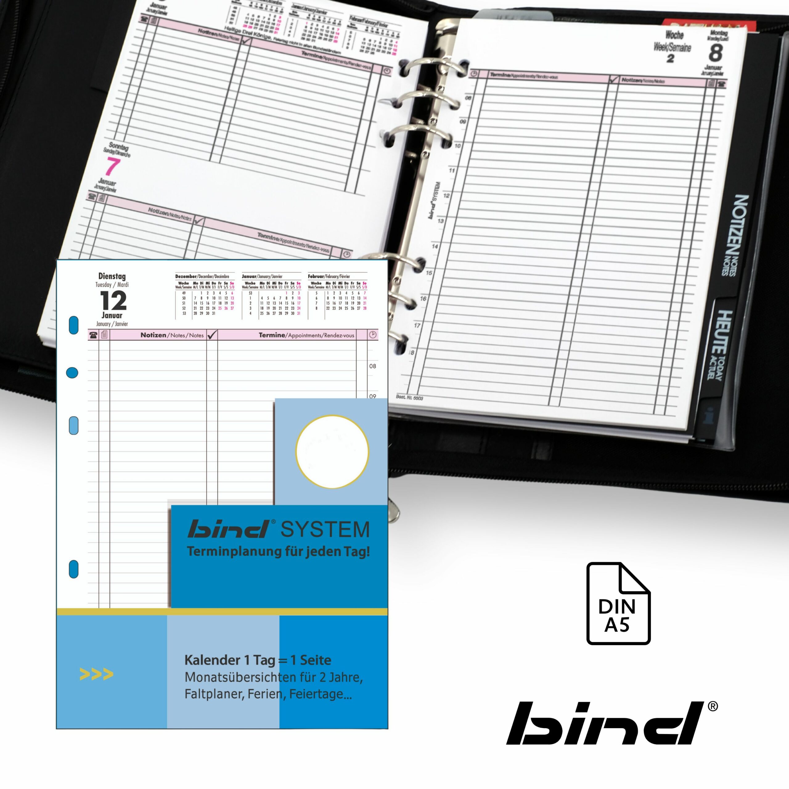 A5 calendar 1 day = 1 page in 3 languages