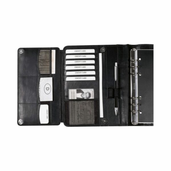 Manager planner A5 with zip, equipped with: Calendar. Inside: Zipped compartment with magnetic press studs, large slip pocket on the right, two writing instrument loops incl. Quattro pen, six business card slots. Calendar: 1 week = 2 pages.