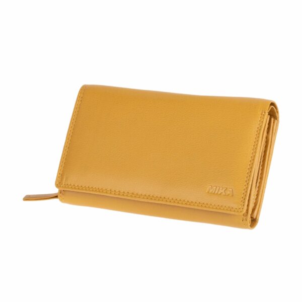 The women's wallet in yellow from Mika is a stylish and practical accessory that has been specially designed for women who appreciate a trendy and modern look. The wallet is made of high-quality leather and impresses with its elegant design. The Mika ladies' wallet in yellow has several compartments for credit cards, ID cards and other important documents. There is also a large zip compartment for coins and notes and another compartment for banknotes. The wallet offers enough space for all your personal items and can be conveniently stored in your handbag. The wallet comes in a bright yellow colour that will put you in a good mood and is ideal for the summer. The high-quality leather ensures durability and the careful workmanship guarantees high quality.