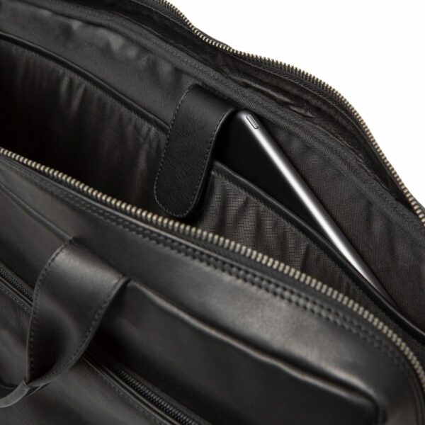 The "Mover" laptop bag from Pride and Soul is a stylish and robust bag that has been specially developed for transporting laptops and other important work items. It comes in black and is made of high-quality leather, which gives it an elegant and professional look. The bag offers space for laptops with a screen size of up to 15 inches and has a padded laptop compartment that protects the laptop from bumps and scratches. It also offers numerous other compartments and pockets that provide sufficient storage space for accessories such as documents, cables and chargers. The bag has an adjustable, detachable shoulder strap that makes it comfortable to carry and can be removed if required. Overall, the Mover laptop bag from Pride and Soul is an excellent choice for anyone looking for a stylish and practical bag for their laptop.
